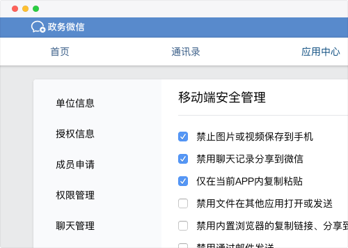 移动终端运行在沙箱隔离环境内,所有的数据落地加密,同时可通过设备管理远程擦除终端的数据;支持禁用“保存到本地”、“转发”、“复制”、“分享”等完善的管控能力,保证终端数据安全。