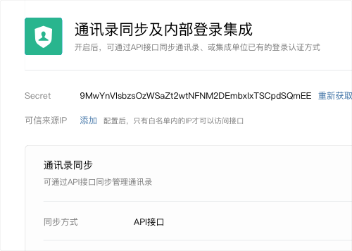 可通过API双向同步已有的通讯录,实现人员调动、成员信息更新更及时;支持对接AD或已有的统一登录软件终端,并可通过HTTP的方式集成其他帐号体系,实现统一的登录认证体系。